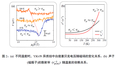 该工作利用YIG具有低磁性阻尼系数的优点,围绕YIG/Pt异质结中自旋塞贝克效应开展研究。如图2所示,随着测量温度升高,自旋塞贝克电压会在高磁场下,得到增强或者抑制。该现象依赖于磁振子和声子散射率的竞争结果。低温下,散射主要由杂质贡献,当声子散射率大于磁振子散射率时,耦合效应使得磁振子极化子弛豫时间减小,磁振子极化子流被抑制,自旋塞贝克电压呈现谷。反之,在高温时,由于磁振子散射率随温度上升增加更快,并在250 K以上超过声子的散射率,此时对磁振子极化子流产生增强,自旋塞贝克电压线形呈现为峰。进一步实验表明,如果低温时满足磁振子散射率大于声子散射率,则自旋塞贝克电压在所有温度下均得到增强,线形呈现为峰。综上所述,我们的实验说明磁振子极化子的弛豫机制可以用散射率的权重平均很好解释,非弹性散射在理解磁振子极化子的弛豫机制中十分重要,这将为研究磁振子相关散射和提高材料磁弹耦合效应提供新的思路。