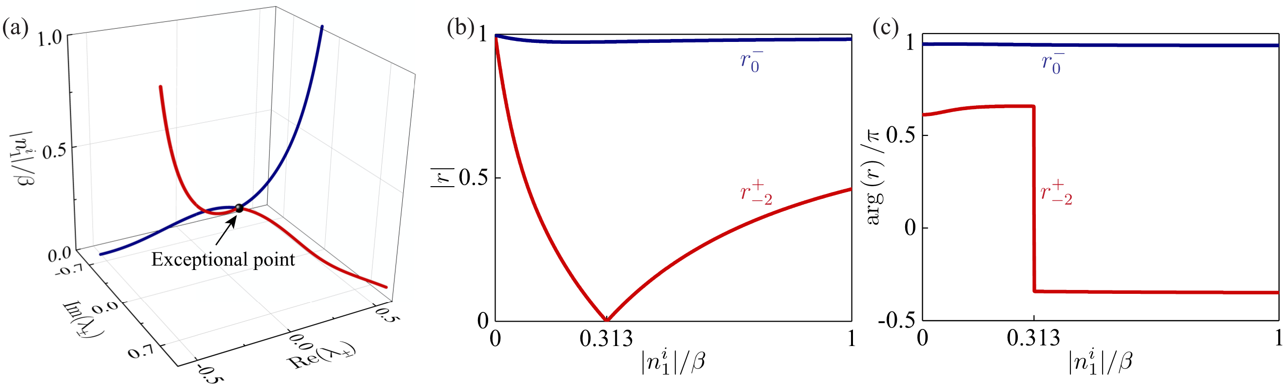 图2 (a)散射矩阵本征值随损耗的变化轨迹。(b)反射系数幅值和(c)相位随损耗变化的示意图。