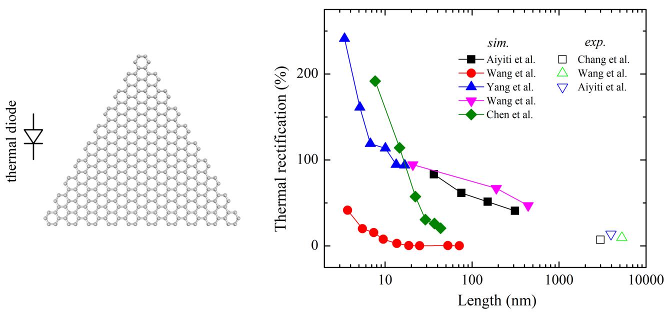 此外,Li等人35证明不对称的界面热阻会导致独特的热整流现象。热整流效率展现了很强的尺寸依赖性,如图3所示。例如,Yang和Chen等人31, 33在石墨烯纳米带和石墨烯/ 六方氮化硼(h-BN)中发现,热整流效率随着系统长度的增加而迅速降低。因此,为实现高效率热整流器件,尺寸效应是必须要考虑的重要因素。