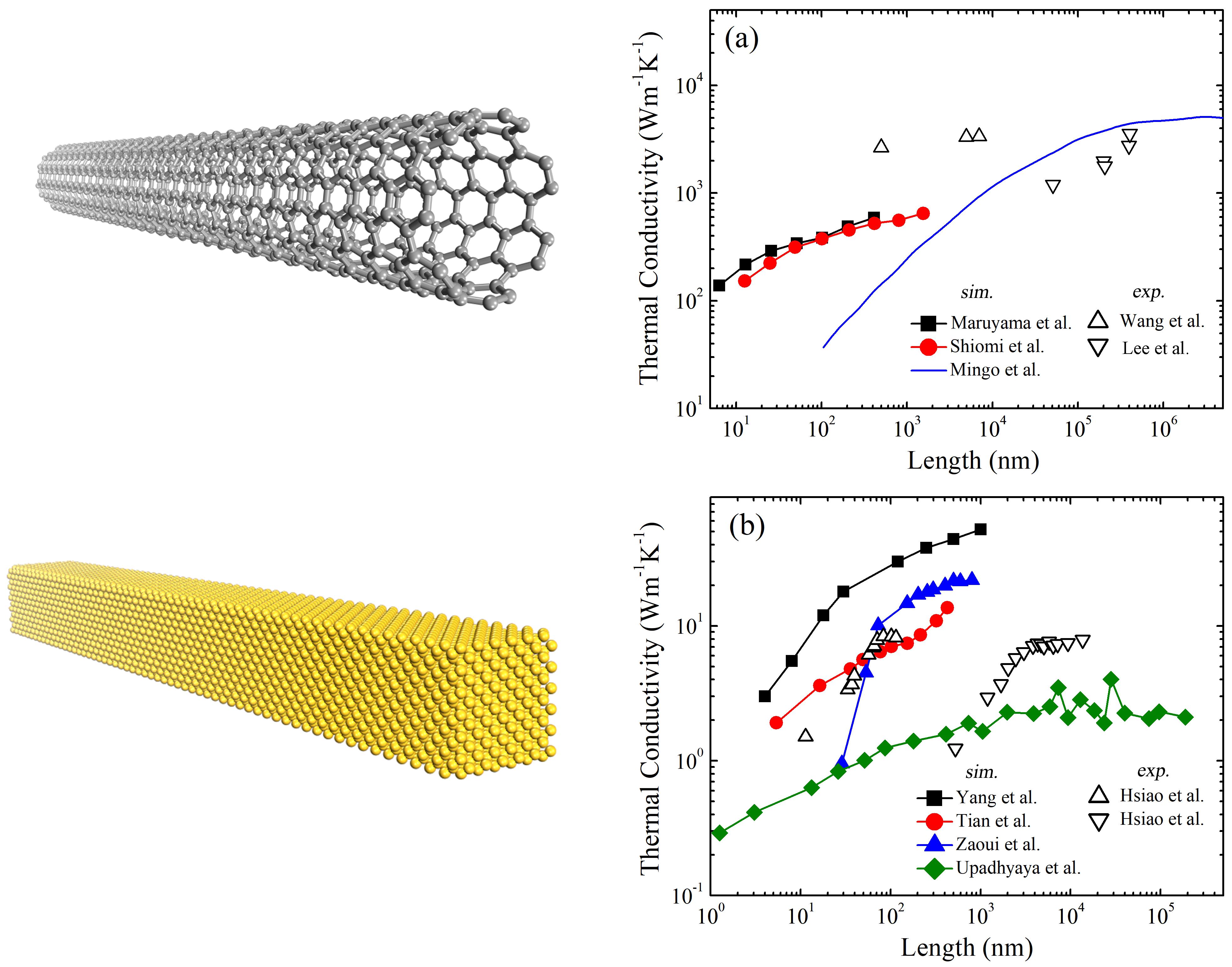 图1. 一维纳米材料中热导率的尺寸依赖关系。(a)碳纳米管中热导率随长度的依赖关系。数据分别来自Maruyama et al.1,Shiomi et al.2,Mingo et al.3,Wang et al.4和Lee et al.5。(b)硅纳米线中热导率随长度的依赖关系。数据分别来自Yang et al.6,Tian et al.7,Zaoui et al.8,Upadhyaya et al.9 和Hsiao et al.10, 11。