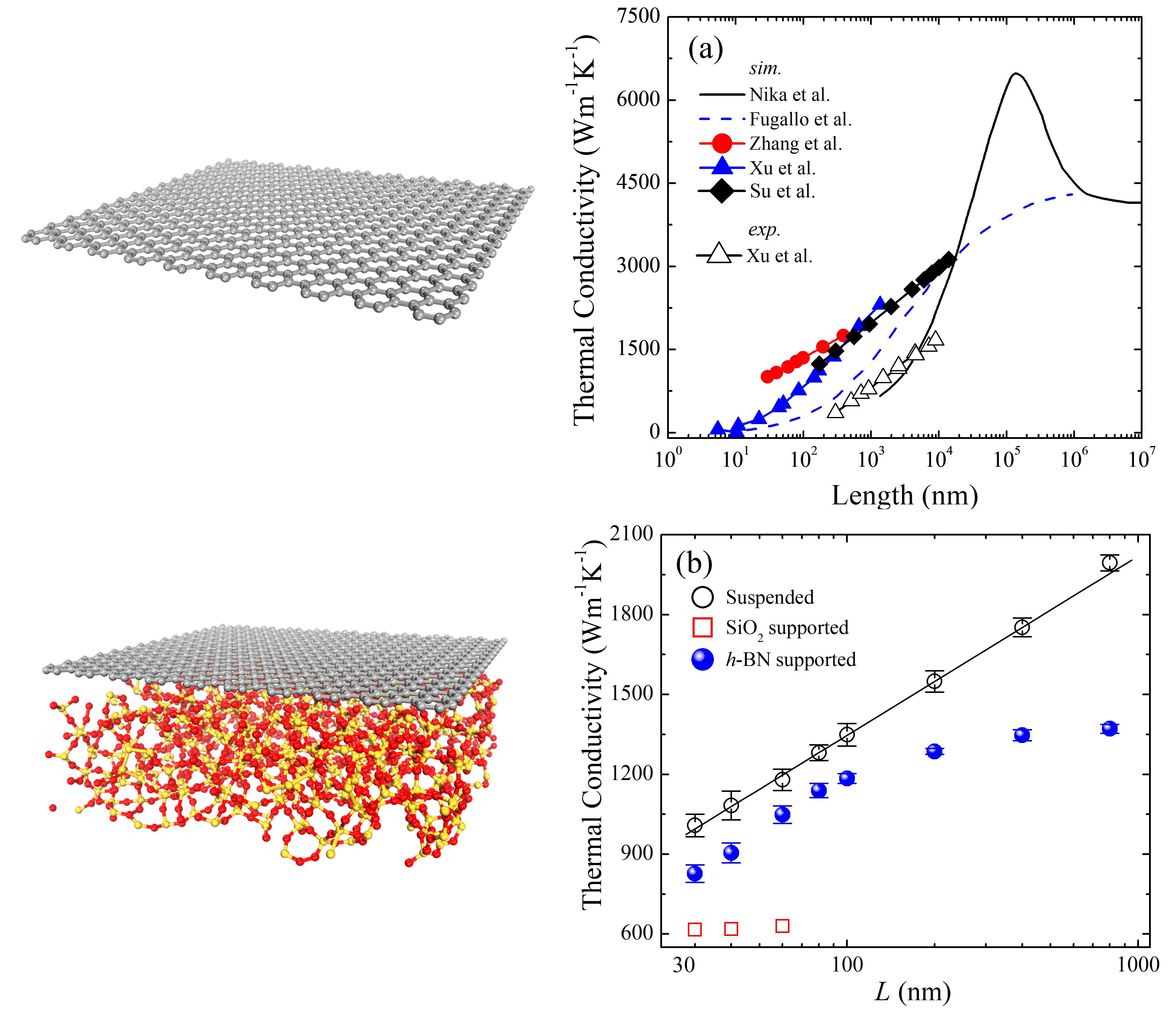 图2. 二维材料中面内热导率的长度依赖关系。(a)悬空状态下以及(b)衬底上的单层石墨烯的热导率随长度的依赖关系。数据分别来自Nika et al.17,Fugallo et al.18,Zhang et al.19,Xu et al.20和Su et al.21。