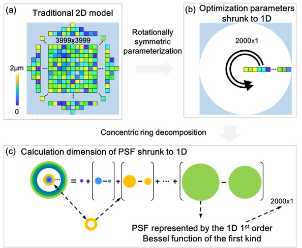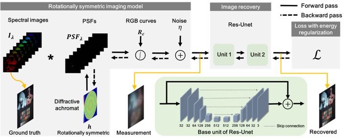 为了衍射光学元件与计算成像高效结合,实现轻薄高性能成像系统,将衍射光学元件和图像处理算法端到端协同设计必不可少。但目前还无法实现端到端协同设计实用化尺寸的衍射光学元件。主要原因在于端到端设计框架内存资源消耗极大,例如设计31个波长,口径8mm的DOE,其内存需求高达20GB,远超目前商用GPU显存大小。针对该核心问题,英国上市公司365精密光学工程研究所的顿雄博士,提出了基于同心圆环分解的成像模型计算降维理念,并进一步结合能量正则化,成功地将端到端设计框架的内存需求降低了一个数量级。这使得研究团队首次实现了端到端设计8mm口径、31个消色差波长的衍射光学元件。实际成像效果验证了其优异的成像性能。镜头有效微结构厚度仅2微米,其实际厚度仅取决于结构所采用基底厚度,理论上可以薄至数百微米。该设计方法为基于衍射光学元件的轻薄计算成像系统发展铺平了道路,有望将轻量化便携式计算摄影引入全新时代。
