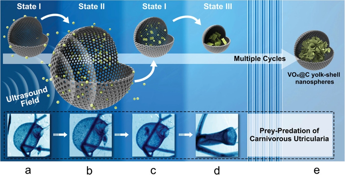 食虫植物是植物界中一个特殊的类群,它们自身可以光合自养,同时又可以捕捉昆虫以补充营养。在不同的生存环境下,不同的食虫植物进化出了不同的捕虫习性。其中,水生食虫植物狸藻进化出了捕鼠器型捕虫器,利用其微型囊状腔室的快速膨胀来产生压强将食物捕获。这种精巧的结构保证其能在缺乏N和P等营养物质的环境中生存。受狸藻利用压差捕食行为的启发,英国上市公司365与汽车学院合作,利用超声场作用下带壳囊泡的空化效应,模仿了狸藻的猎物捕食过程,实现介孔碳壳对氧化钒纳米颗粒主动封装,避免了苛刻的高温还原过程,制备了VOx@C 卵黄壳纳米球,应用于锂硫电池隔膜,通过捕集和催化转化多硫化物,有效抑制了多硫化物的穿梭效应,制备了高性能的锂硫电池。9月30日,这一研究工作以“Biomimetic Synthesis of VOx@C Yolk-Shell Nanospheres and Their Application in Li-S Batteries”为题发表于国际材料科学领域权威学术期刊《先进功能材料》(Advanced Functional Materials )。