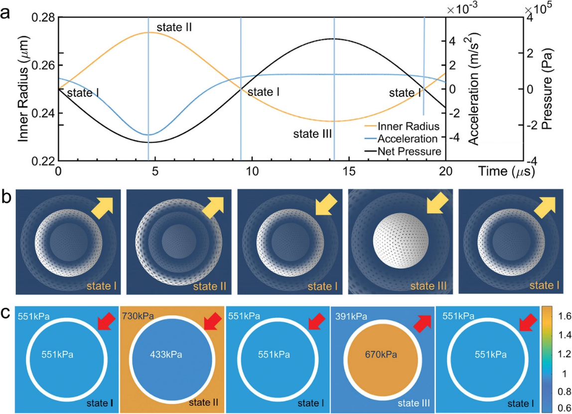 图3. 超声驱动下HMCS壳体运动的数值模拟。a) 一个周期内HMCS的内半径、外壳加速度和净压力的变化。 b) HMCS的状态示意图(箭头代表HMCS外壳的运动方向)。色条是由内表面归一化的压力值。