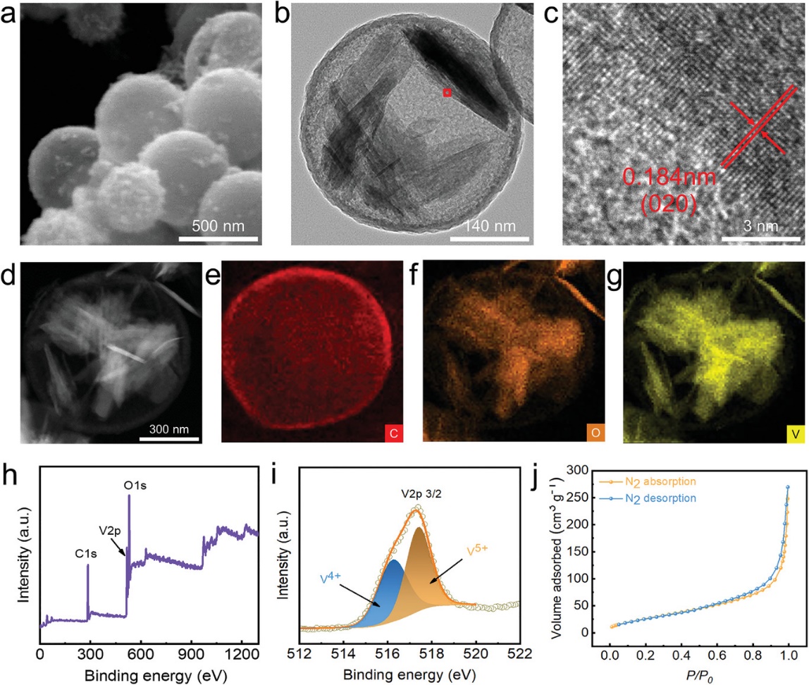 图2. VOx@C卵黄壳纳米球的a)SEM图像,b)TEM图像,c)高分辨率TEM图像,d-g)HAADF-STEM图像和元素图谱,h)XPS光谱,i)高分辨率V2p XPS光谱,j)N2吸附-解吸等温线。