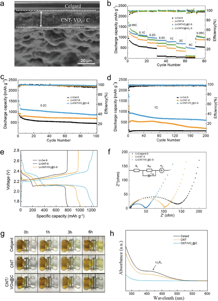 图4. VOx@C卵黄壳纳米球作为锂硫电池RSL的应用。a)CNT/VOx@C RSL的横截面SEM图像。b)倍率性能,在c)0.2 C,d)1 C的长循环性能,以及相应的库伦效率。e) 分别使用Celgard PP隔膜、CNT RSL和CNT/VOx@C RSL的锂离子电池的初始循环充放电曲线和f) Nyquist图。 g) 在使用Celgard PP隔膜、CNT RSL和CNT/VOx@C RSL的H型池中,多硫化物扩散的可视化演示。(h)H型池右侧池溶液的红外光谱