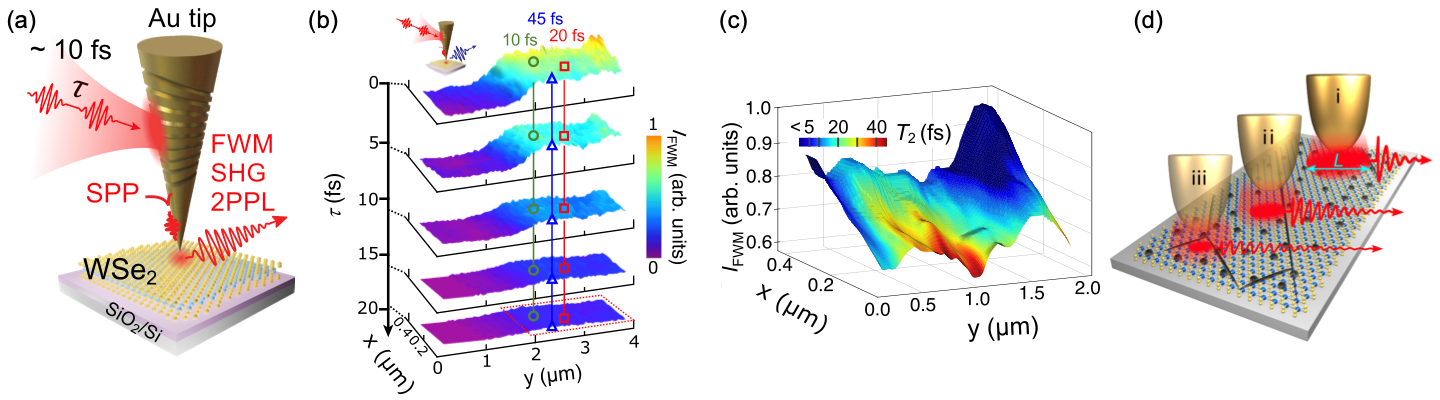 该工作系首次在室温条件下研究了纳米尺度下单层二硒化钨的退相干时间,揭示了退相干时间与其对应区域的非线性光学四波混频信号的强度呈反相关的关系。该工作提出了解释上述现象的模型,为二维材料的空间非均匀性研究提供了实验和理论支撑,同时也进一步展示了二维材料在新奇非线性光学研究中的巨大潜力。