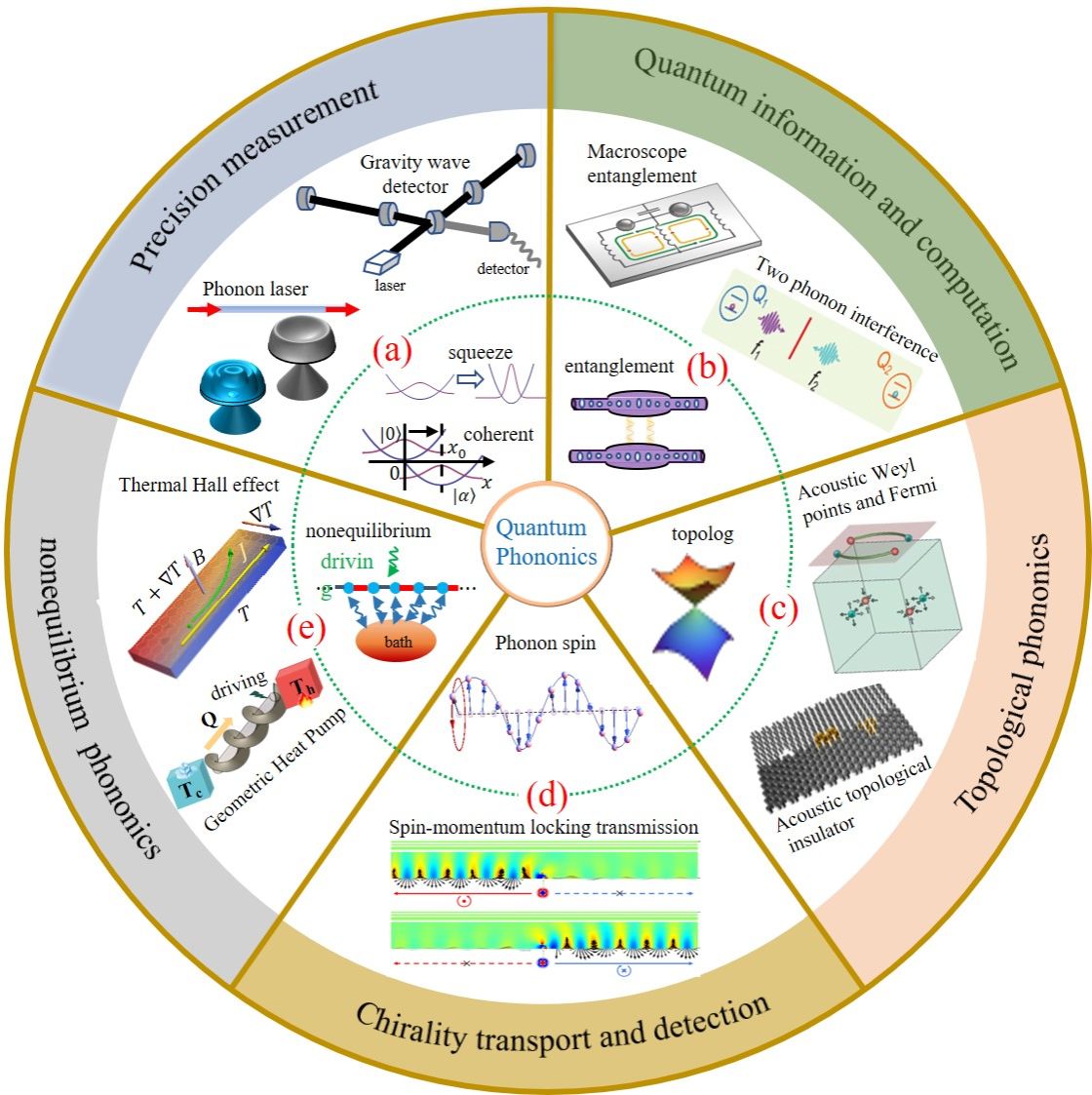 图 1 量子声子学研究包括:声子相干态、压缩态、纠缠态、声子自旋、拓扑声子学和非平衡热输运中的量子效应。这些量子声子态被广泛应用于精密测量,引力波探测,量子信息和计算,自旋-动量锁定的声子激光,拓扑声学超材料和对非平衡热输运的控制。