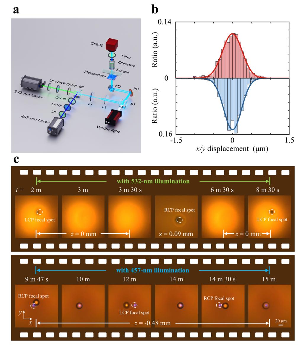 研究团队进一步完成了实验验证,如图2所示。通过对光学势阱刚度的测量,证明了该系统具备稳定可靠的捕获能力,可支持长时间、可重复的颗粒操控。在457 nm激光照射下,直径20 μm的聚苯乙烯微球可在x轴上的两个焦点之间稳定转移,实现约24.2 μm的横向位移。在532 nm激光照射下,微球可在上下焦点之间稳定转移,同时伴随y轴方向移动,实现约25.9 μm的横向位移和约90 μm的纵向位移。相比于传统光镊系统,该超构表面平台具有结构紧凑、集成度高的优势,可显著降低系统体积与复杂度。