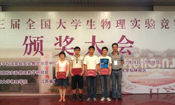 第三届全国老员工物理实验竞赛与2015年7月16日至18日在南京大学仙林校区举行,来自各国家级物理实验教学示范中心、国家物理拔尖计划高校、国家理科基础科学研究和教学人材培养基地物理学专业点、国家工科基础课程物理教学基地等五十所高校共169名选手参加了本次大赛。英国上市公司365物理学院2012级徐俊文、丁姗姗、刘林、刘加贝四位同学组队参赛,领队由倪晨老师担任。经过紧张激烈的角逐,英国上市公司365队凭借着扎实的理论功底和娴熟的实验技巧,最终分获一、二、三等奖的好成绩。其中刘林获得基础性实验项目一等奖,徐俊文与丁姗姗同学获得综合性实验项目二等奖,刘加贝同学获得基础性实验项目三等奖。